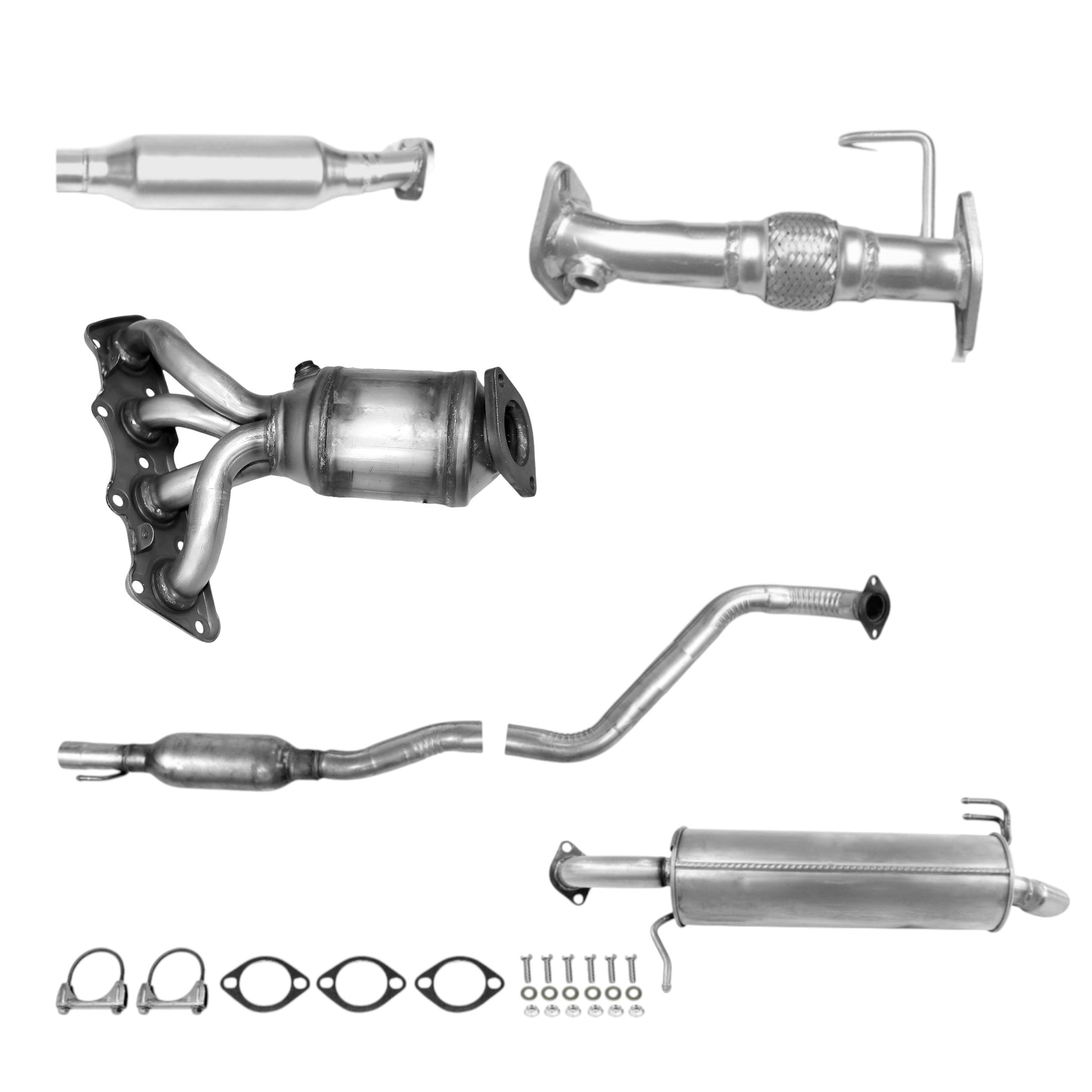 Restore your Kia Rio’s exhaust with this complete direct-fit system, including manifold converter, flex pipe, catalytic converter, resonator, and muffler for 1.6L hatchback models.